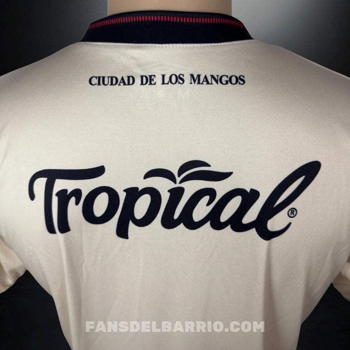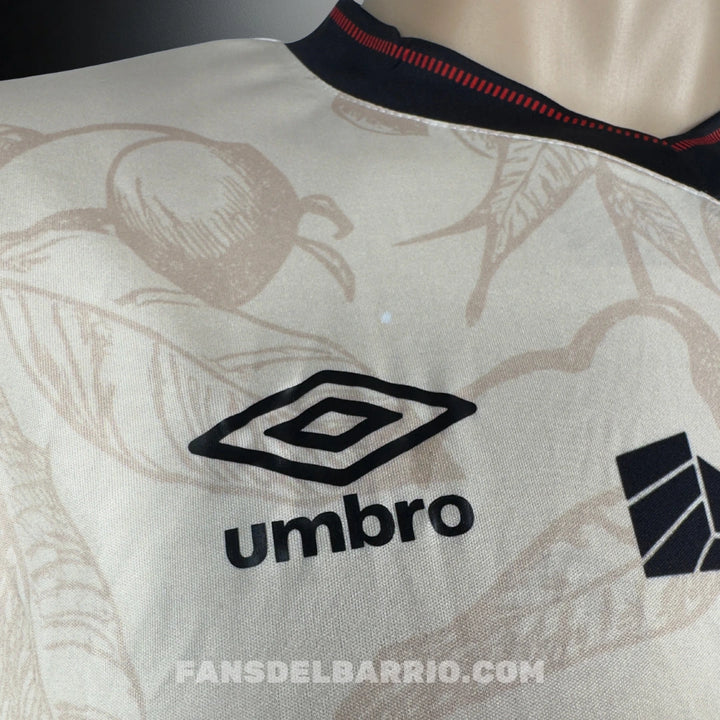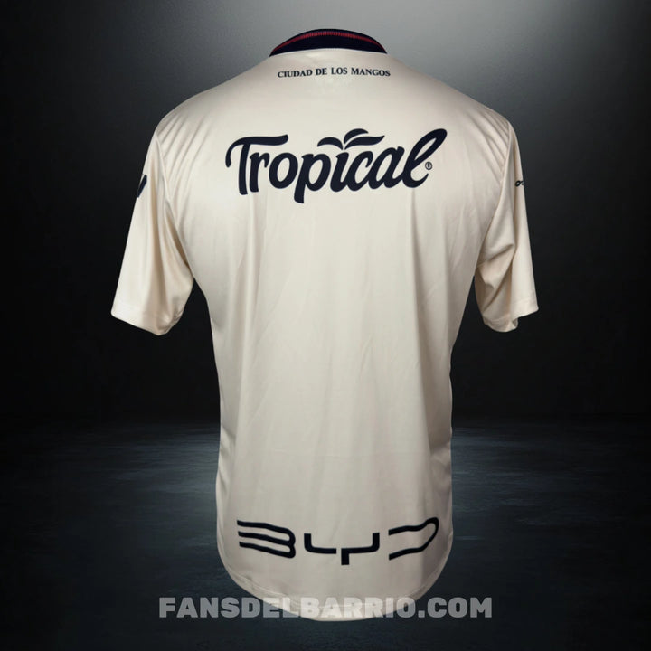 El escudo de la Liga brilla en el pecho con orgullo, recordando a la afición que cada partido es una nueva oportunidad para escribir historia. Su tonalidad clara, adornada con un patrón sutil de hojas, conecta con la tradición y con la tierra que vio crecer al equipo rojinegro.