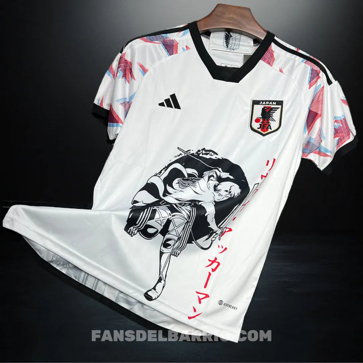Donde el anime y el fútbol se encuentran en una pieza épica. Esta edición especial de la selección japonesa celebra la fusión entre el deporte y la cultura pop con una colaboración oficial inspirada en Shingeki no Kyojin (Attack on Titan). El protagonista visual es Levi Ackerman, símbolo de disciplina, precisión y coraje — valores que reflejan perfectamente el espíritu del fútbol japonés.