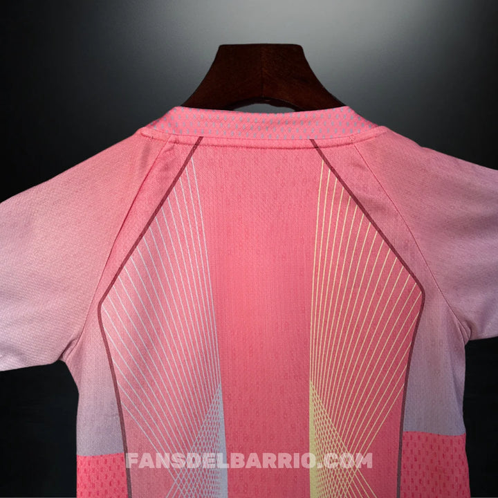 El Kit para Niño del F.C. Barcelona 2025/26 Edición Especial Rosa destaca por su diseño innovador en tonos rosa con detalles degradados, acompañado de pantalón azul marino. Este conjunto permite a los más pequeños vestir con orgullo los colores del Barça en una versión moderna y llamativa.